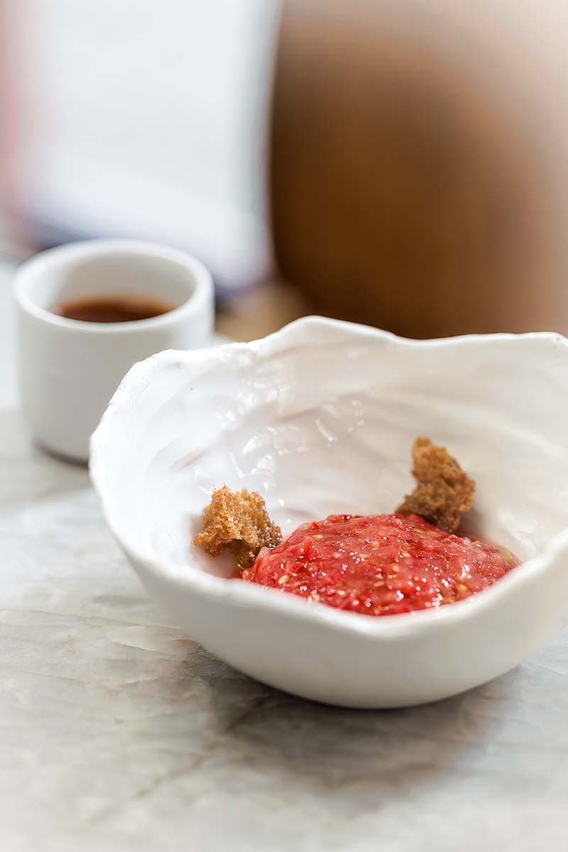 A dining experience at Plates intrigues and surprises. Each dish opens a new world. Beautifully balanced, yet exciting at the same time. Sour, sweet, umami. Crispy and creamy. Textures with thoughtful depth. Kirk is convinced we can reprogram our taste palate. That we can rid ourselves of the flavours that our taste buds have come to regard as truth throughout our lives. Like sugar, dairy and meat. He creates with the end in mind: “My dishes start with the best pure, healthy ingredients. I'm always looking: which ones are interesting? How do I bring out the best in them? If I use strawberries, they must be the tastiest ones. And without pesticides, of course. I want to know where that maitake (hen of the woods) comes from. In what soil it grows and who the grower is. I am on top of it. I want as much information as possible about growers, farmers and producers, to select products of the highest quality, but also to come up with new ideas. For instance, we found a very special tomato, grown from Japanese seeds. These 'amelas' cost £3 each, but they are the hero of the dish. We serve them beautifully chopped with a dressing of verjuice, radishes, sour gooseberries, creamy ricotta and icy tarragon granito. With that comes a broth of barbecued tomatoes."