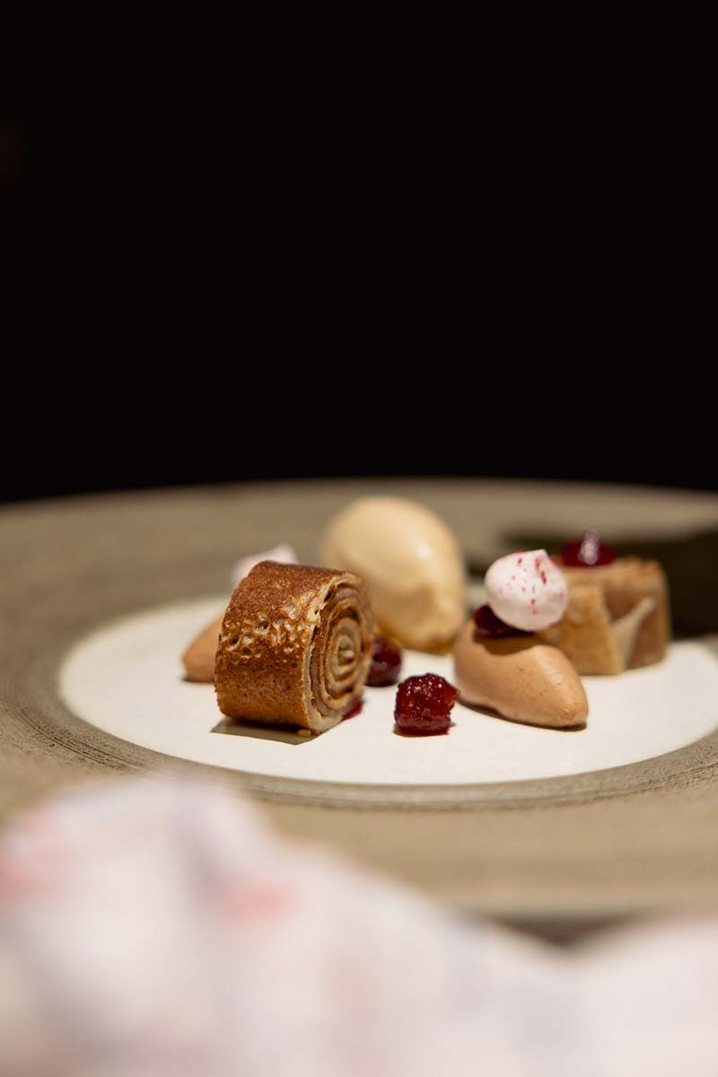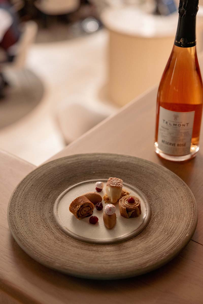 The Telmont Réserve Rosé, has flavors of red fruit—cherries, raspberries—brioche notes, slightly fatty. Hence the buckwheat pancakes. Buckwheat is a poor man's grain from the declining region where we live. It is grown in our greenhouse. The apples from our yard are cooked in caramel syrup. Cranberries and hazelnuts also come from the northern Netherlands, and we picked the chestnuts ourselves. The Madeira sorbet ultimately brings everything together. That's the only ingredient that comes from further afield."