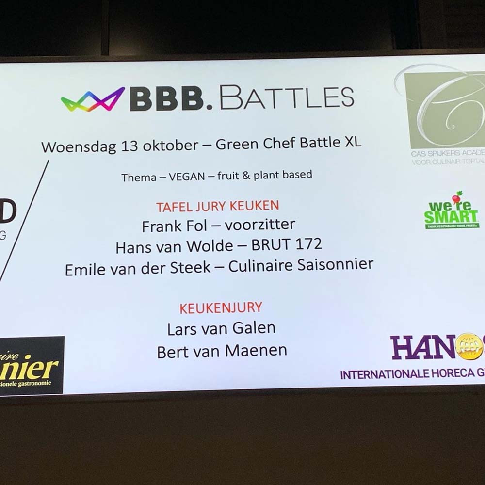 During the cooking competition, 6 teams of 2 persons prepared a complete fruit- and plant-based starter and main dish. They presented their dishes to a professional jury consisting of Frank Fol of We're Smart, Philippe Schroeven of Culinaire Saisonnier magazine and a representative of the Culinary Team The Netherlands (CTTN).