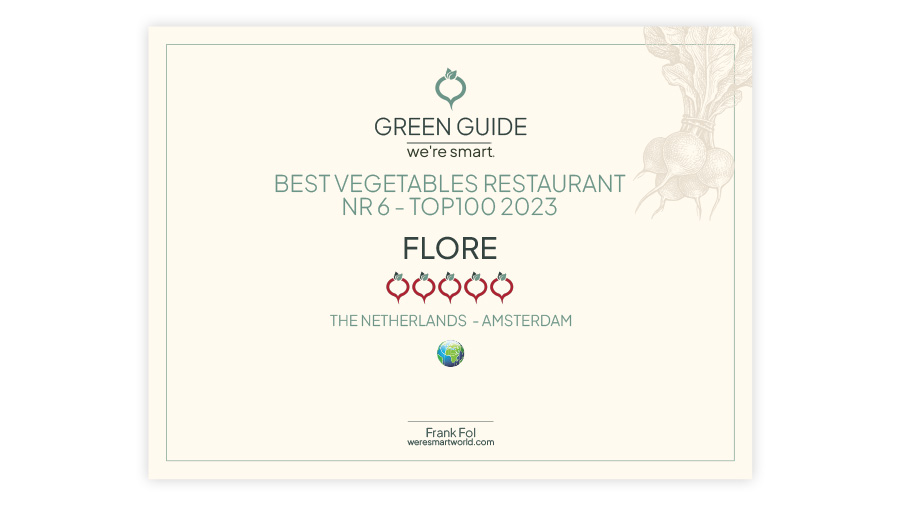 Flore has undergone a true metamorphosis! It is clear that Chef Bas van Kranen has a strong and ambitious vision: to take the restaurant to the very top of the global pure plant movement. And according to the We’re Smart Green Guide, his mission has been accomplished. The restaurant has found its soul and now radiates beauty in every detail. The complete culinary experience is remarkable, with the “Botanic Menu”, built from 80 different plants, standing proudly among the finest 100% pure plant dining experiences in the world. What makes it even more powerful is the unity of the entire Flore team — all working with the same passion and direction, creating an experience that is both authentic and unforgettable. We are proud to have such a We’re Smart ambassador at the heart of our movement, showcasing what a true pure plant restaurant stands for. Congratulations!